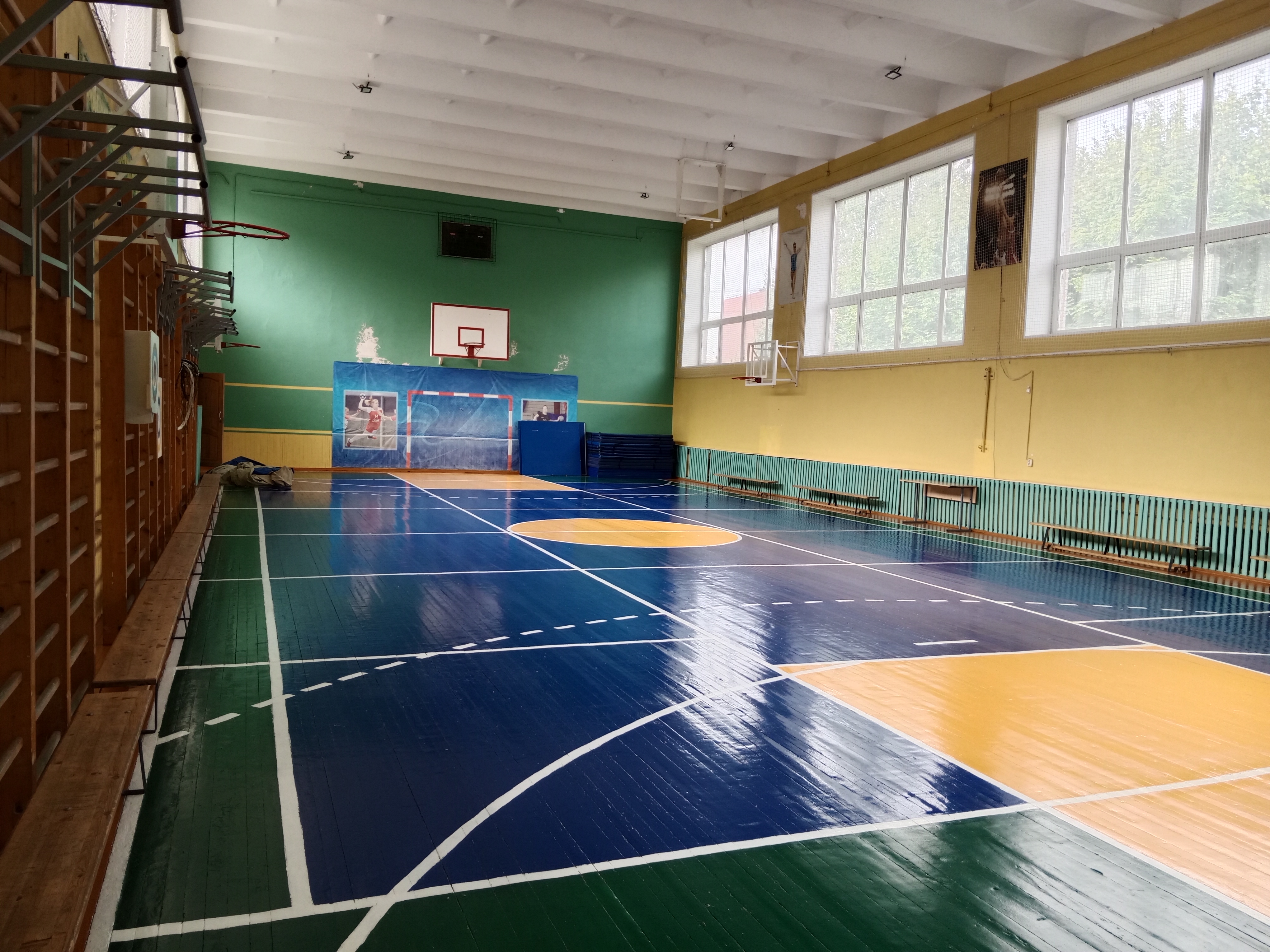 В школе есть физкультурный зал (пл. 288 м2) и малый зал, расположенные на 1 этаже, где проводятся игры, соревнования в лагере.