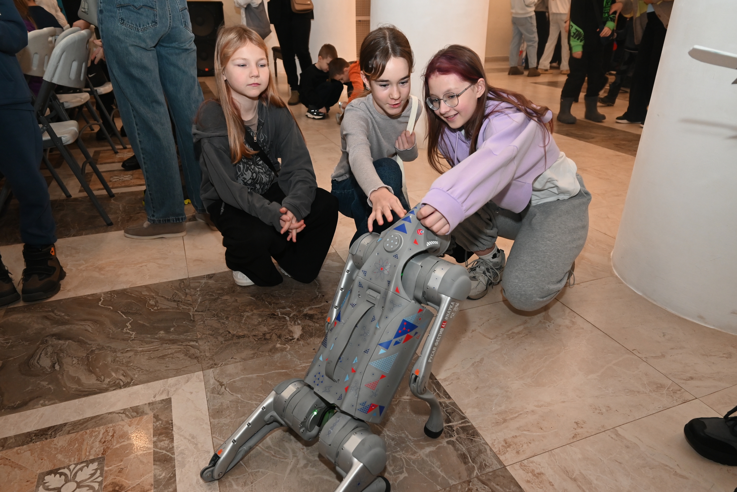 Бионический робопёс АЛЬТ: стал настоящим центром притяжения Он разгуливал по холлам, встречал гостей, танцевал с ними и посылал воздушные сердца.